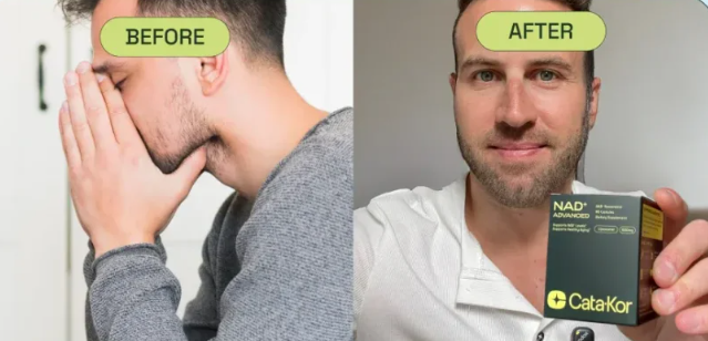 Before vs.8 Weeks using Cata-Kor“| started taking this after noticing low energy and dull skin.Two months in, l feel sharper, more aalert, and my skin looksnoticeably healthier."